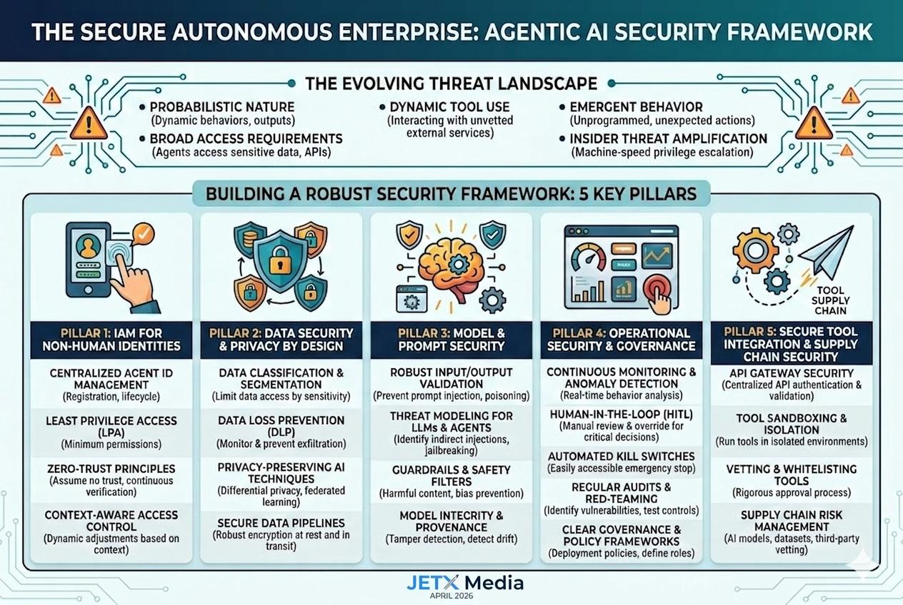 To effectively secure the autonomous enterprise, organizations must adopt a multi-layered, proactive security framework that addresses the unique challenges posed by Agentic AI. This framework should encompass identity, data, model, and operational security.
